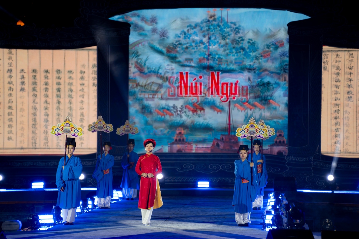 Hành trình nghệ thuật ấy đưa người xem đi từ sự trang nghiêm của đại triều đến vẻ bình dị của đời sống thường nhật; từ hồn thiêng sông núi đến những bảo vật ngàn năm lắng đọng trong ký ức cố đô. Những vần thơ của các Hoàng đế không chỉ được xướng đọc mà còn được “kể lại” bằng ngôn ngữ sân khấu đa tầng, giàu tính biểu tượng.